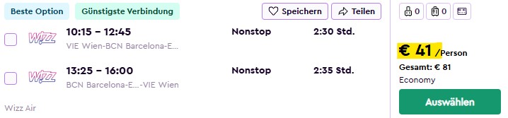 Jetzt heißt es wieder schnell zuschlagen! Wir haben einen tollen Deal bei Skyscanner für Euch gefunden. Es handelt sich dabei um günstige Hin- und Rückflüge nach BARCELONA! Ab Wien fliegt Ihr für nur 41 € pro Person mit Wizzair nach Katalonien. Worauf wartet Ihr noch?!