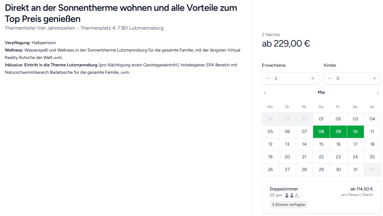 - 1 x ein Tageseintritt für die Sonnentherme Lutzmannsburg für alle Reiseteilnehmer der Buchung (Erwachsene wie Kinder)