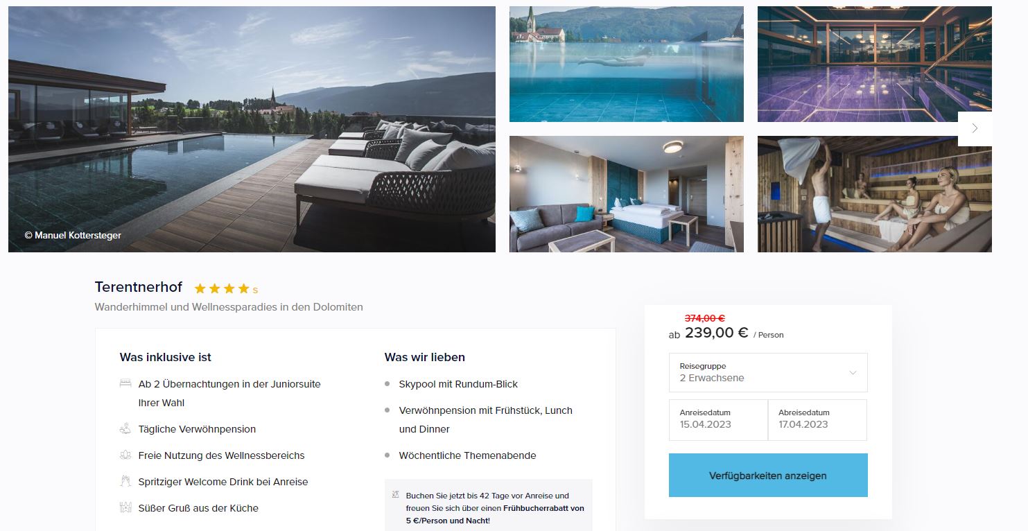 Bei diesem super Schnäppchen von Travelcircus stehen Badespaß, Wellness und Aktivurlaub ganz oben auf dem Programm. Ihr verbringt 3 Tage im 4.5* Hotel Terentnerhof für nur 199 € pro Person, wo Ihr täglich mit einer exklusiven Verwöhnpension verwöhnt werdet. WLAN und Parkplatz sind ebenfalls inklusive. Euer Vorteil: Das Angebot ist bis zu 8 Tage vor Reiseantritt kostenlos stornierbar!