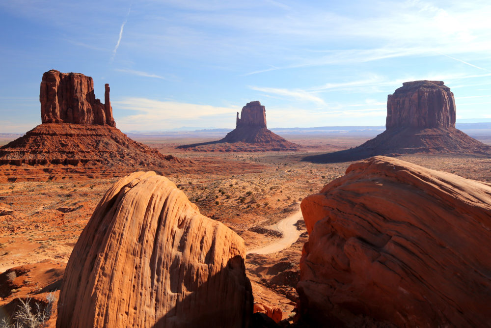Vom Visitor Center aus beginnt der 17 mile loop drive, den Ihr alleine oder mit einer geführten Tour befahren könnt. Während der Rundtour eröffnen sich an jeder Ecke Aussichtspunkte, an denen Ihr aus dem Auto aussteigen und den Blick schweifen lassen könnt. Gleich am Anfang der Tour kommt Ihr an dem zweitschönsten Aussichtspunkt des Monument Valleys vorbei, dem John Ford’s Point mit der Felsformation „three sisters“ und dem bekannten Felsvorsprung, der schon mehrmals für Werbezwecke diente. Hier bieten die Mitglieder des Navajo-Stammes unter anderem Kunsthandwerke, Schmuck und andere Töpferwaren zum Verkauf an. Schaut Euch außerdem die Sandsteinmonumente Elephant Butte und Totem Pole an.