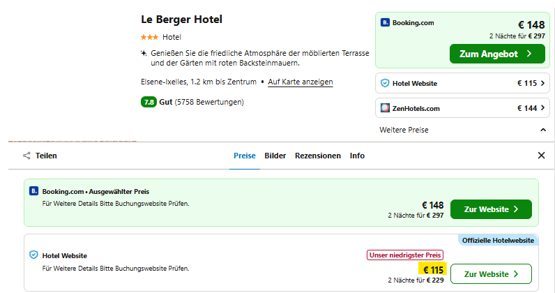 (Achtung: Preis wird pro Nacht für zwei Personen angezeigt; wählt den günstigsten Anbieter)