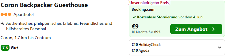Auf den Philippinen erwarten euch nicht nur paradiesische Strände und kristallklares Wasser, sondern auch jede Menge Abenteuer! Nichts wie hin! Wir haben einen tollen Deal fĂĽr Euch zusammengestellt. Zum gĂĽnstigen Preis von nur 625 € pro Person bekommt Ihr 12 Tage im 3* Coron Backpacker Guesthouse sowie den Hin- & RĂĽckflug auf die Philippinen. Möglich ist dies durch eine getrennte Buchung von Hotel und Flug. Â