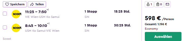 Ihr fliegt zum günstigsten Termin mit Scoot ab Wien. Termine gibt es von Juni 2025 – November 2025. Im Preis ist kein Transfer enthalten. Es bietet sich für Euren Aufenthalt auch ein Mietwagen an, günstige Preise dafür findet Ihr hier.